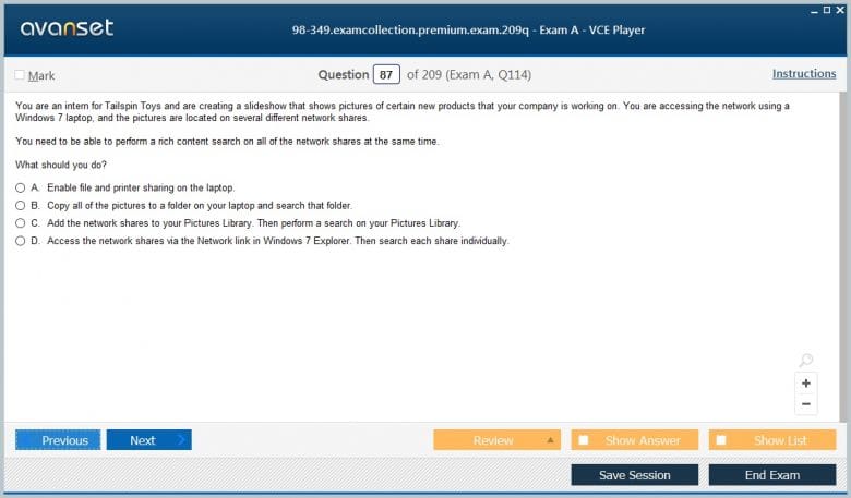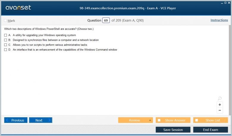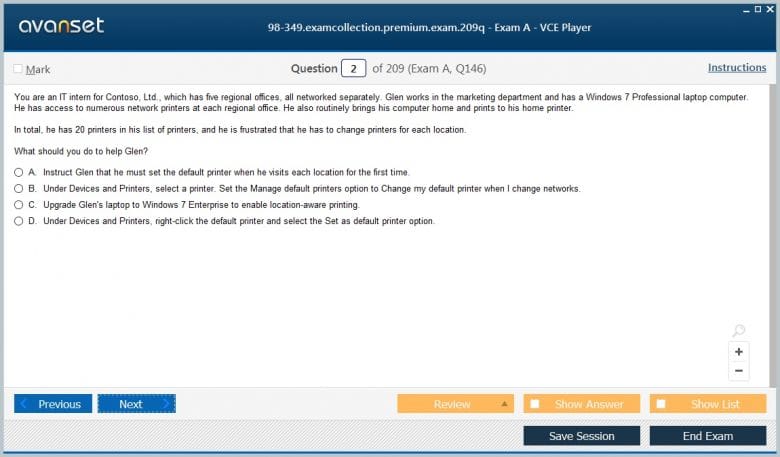Microsoft 98-349 (Windows Operating System Fundamentals) exam dumps vce, practice test questions, study guide & video training course to study and pass quickly and easily. Microsoft 98-349 Windows Operating System Fundamentals exam dumps & practice test questions and answers. You need avanset vce exam simulator in order to study the Microsoft Windows 98-349 certification exam dumps & Microsoft Windows 98-349 practice test questions in vce format.