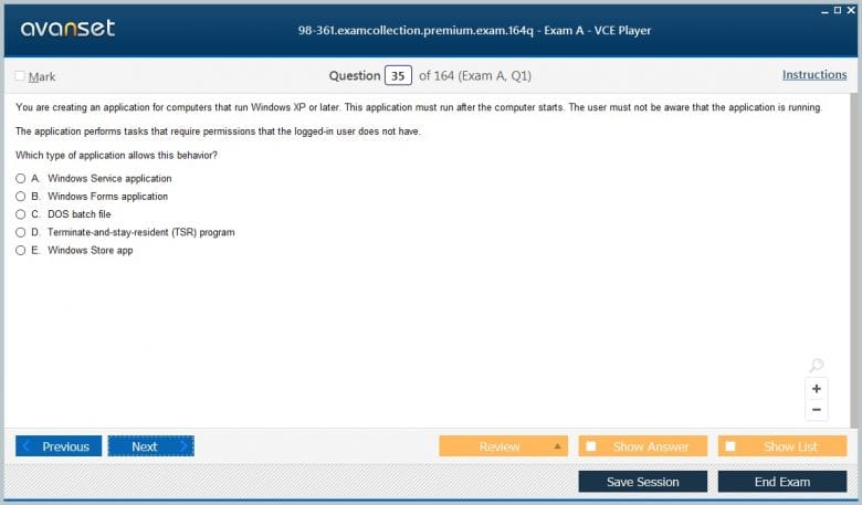 Microsoft 98-361 (Software Development Fundamentals) exam dumps vce, practice test questions, study guide & video training course to study and pass quickly and easily. Microsoft 98-361 Software Development Fundamentals exam dumps & practice test questions and answers. You need avanset vce exam simulator in order to study the Microsoft MTA 98-361 certification exam dumps & Microsoft MTA 98-361 practice test questions in vce format.