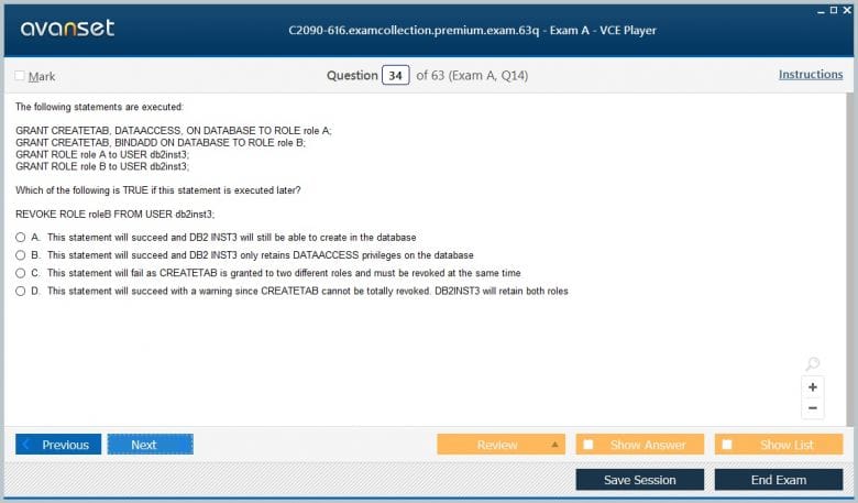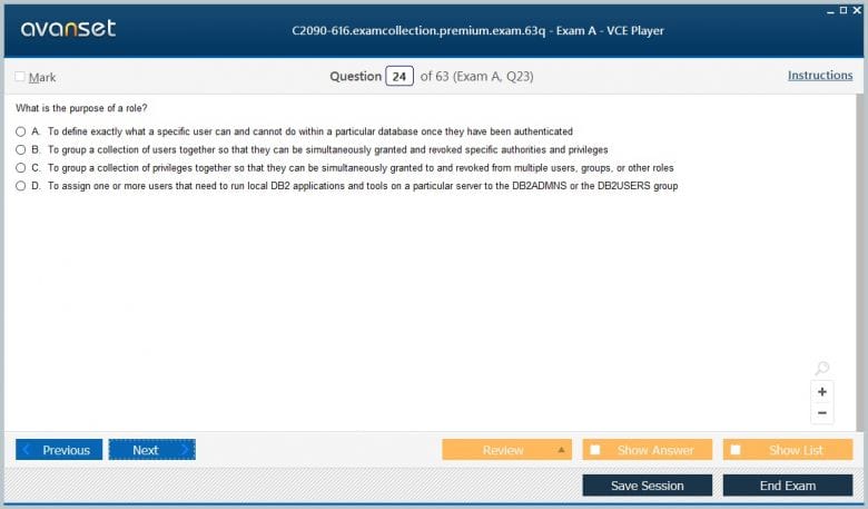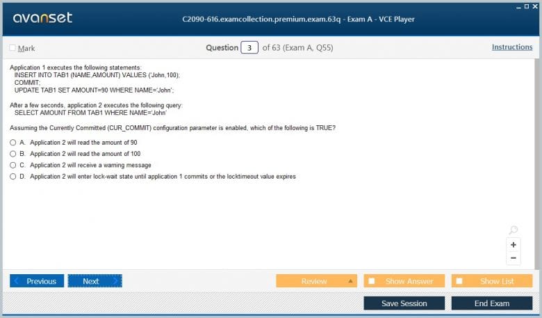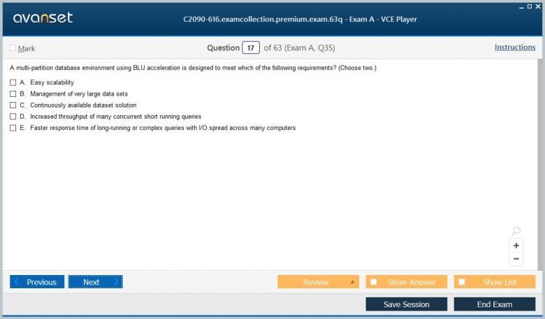 IBM C2090-616 (DB2 11.1 Fundamentals for LUW) exam dumps vce, practice test questions, study guide & video training course to study and pass quickly and easily. IBM C2090-616 DB2 11.1 Fundamentals for LUW exam dumps & practice test questions and answers. You need avanset vce exam simulator in order to study the IBM C2090-616 certification exam dumps & IBM C2090-616 practice test questions in vce format.