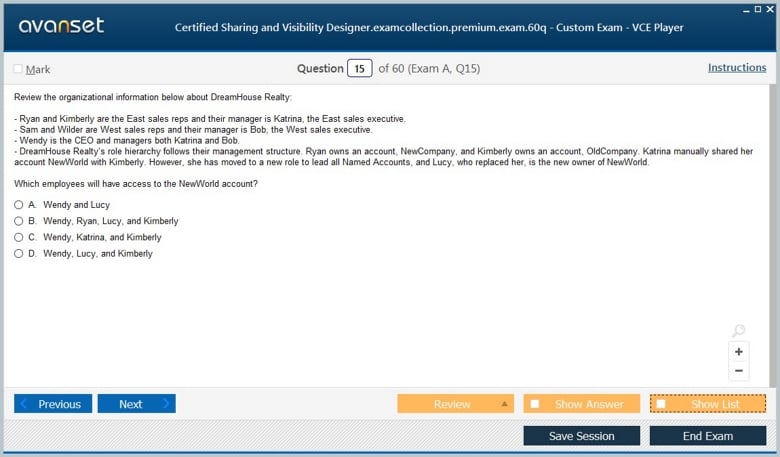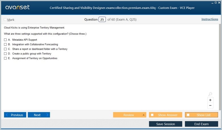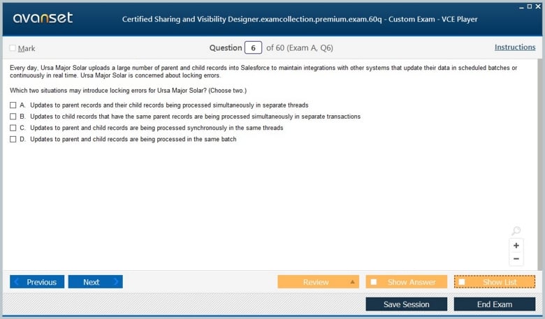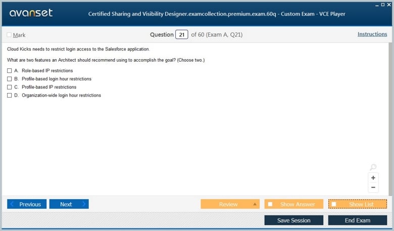 Salesforce Certified Sharing and Visibility Designer (Certified Sharing and Visibility Designer) exam dumps vce, practice test questions, study guide & video training course to study and pass quickly and easily. Salesforce Certified Sharing and Visibility Designer Certified Sharing and Visibility Designer exam dumps & practice test questions and answers. You need avanset vce exam simulator in order to study the Salesforce Certified Sharing and Visibility Designer certification exam dumps & Salesforce Certified Sharing and Visibility Designer practice test questions in vce format.