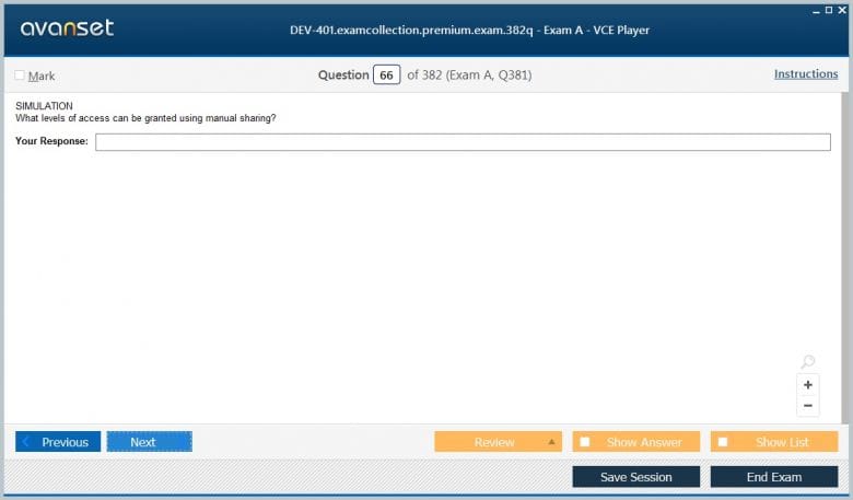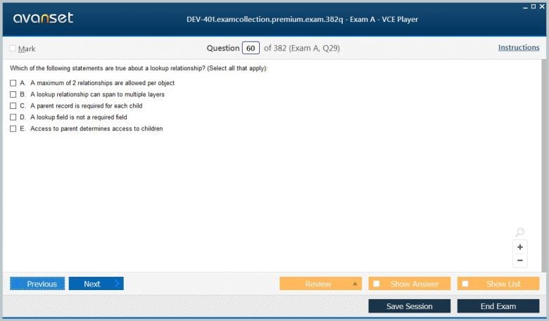 Salesforce DEV-401 (Building Applications with Force.com and Visualforce) exam dumps vce, practice test questions, study guide & video training course to study and pass quickly and easily. Salesforce DEV-401 Building Applications with Force.com and Visualforce exam dumps & practice test questions and answers. You need avanset vce exam simulator in order to study the Salesforce DEV-401 certification exam dumps & Salesforce DEV-401 practice test questions in vce format.